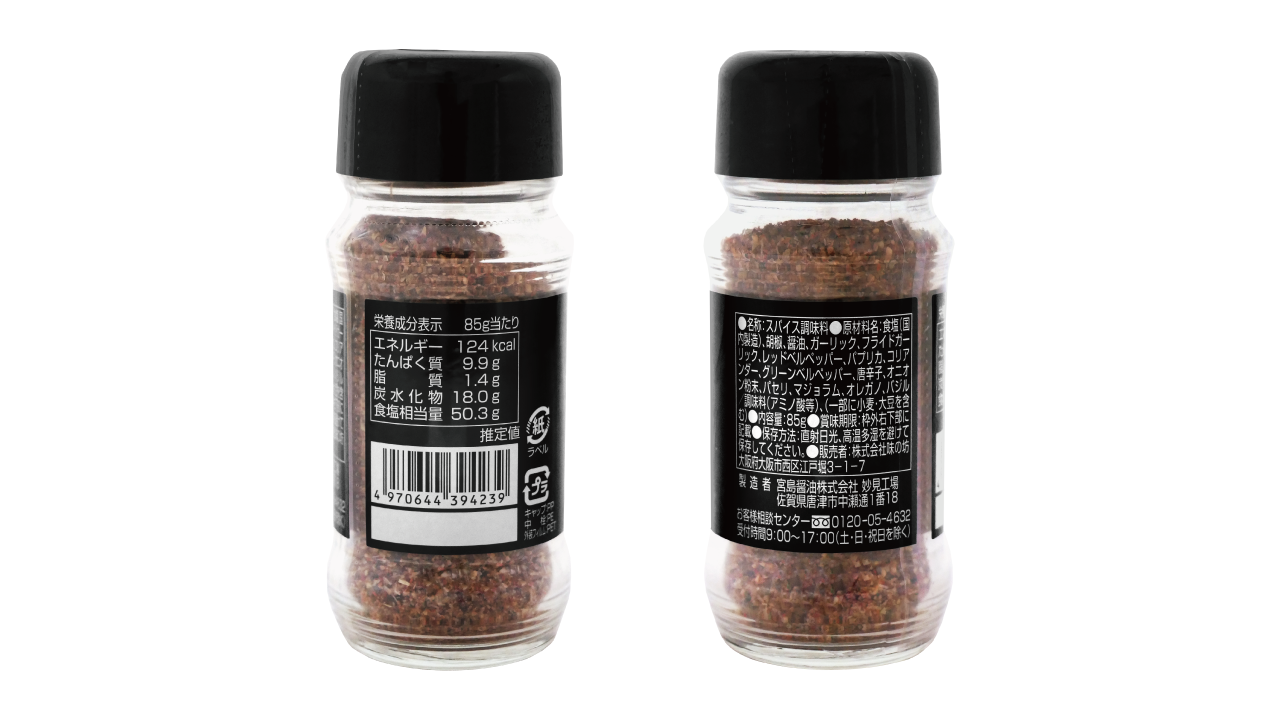 | 原材料名 | 食塩(国内製造)、胡椒、醤油、ガーリック、フライドガーリック、レッドベルペッパー、パプリカ、コリアンダー、グリーンベルペッパー、唐辛子、オニオン粉末、パセリ、マジョラム、オレガノ、バジル/調味料(アミノ酸等)、(一部に小麦・大豆を含む) |