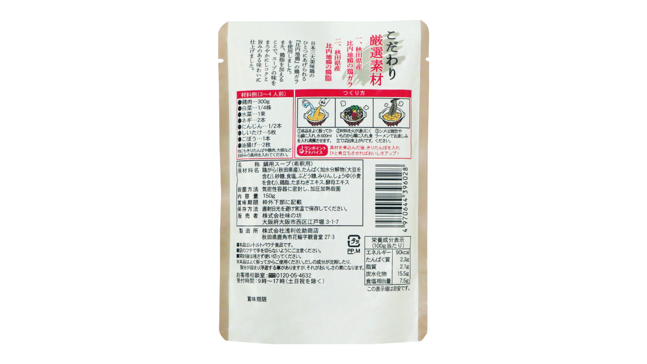 | 原材料名 | 鶏がら(秋田県産)、たんぱく加水分解物(大豆を含む)、砂糖、食塩、ぶどう糖、みりん、しょうゆ(小麦を含む)、鶏脂、たまねぎエキス、酵母エキス |