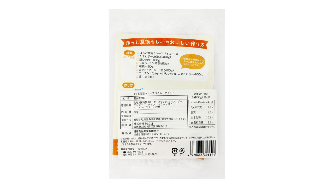 | 原材料名 | 食塩(国内製造)、ターメリック、コリアンダー、ジンジャー、クミン、ガラムマサラ、オニオンパウダー、砂糖 |