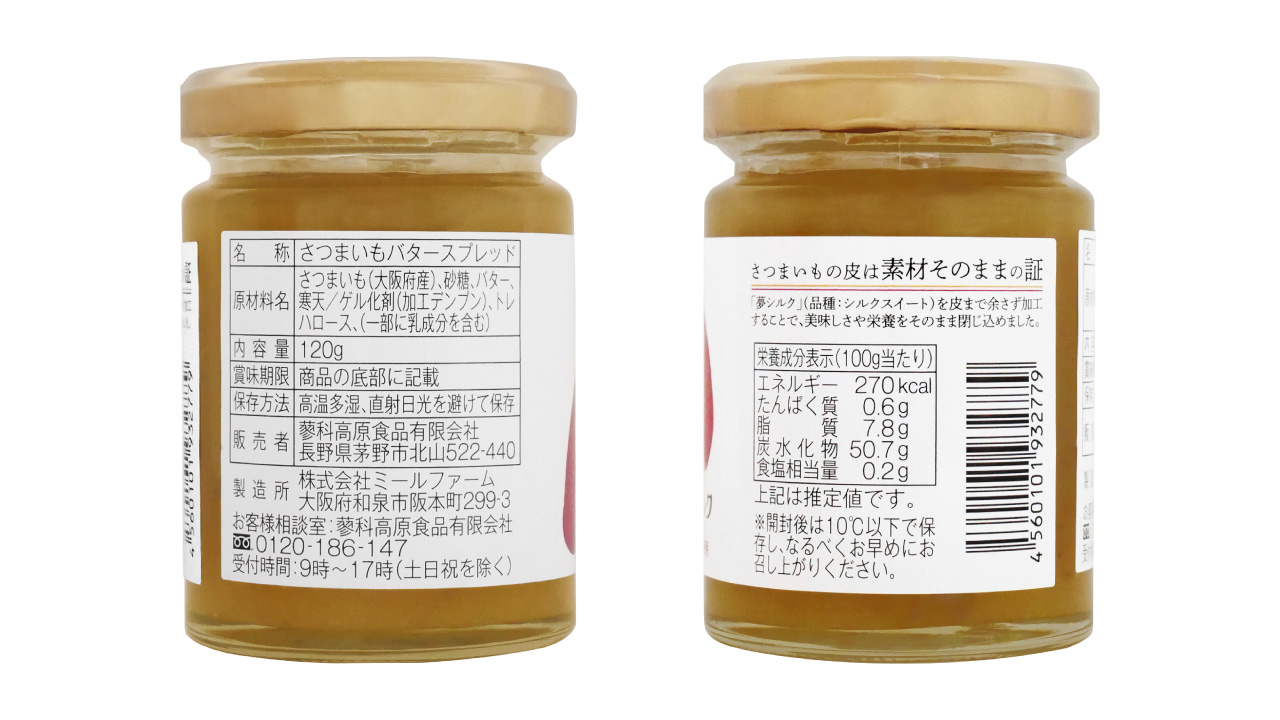 原材料名さつまいも(大阪府産)、砂糖、バター、寒天/ゲル化剤(加工デンプン)、トレハロース、(一部に乳成分を含む)