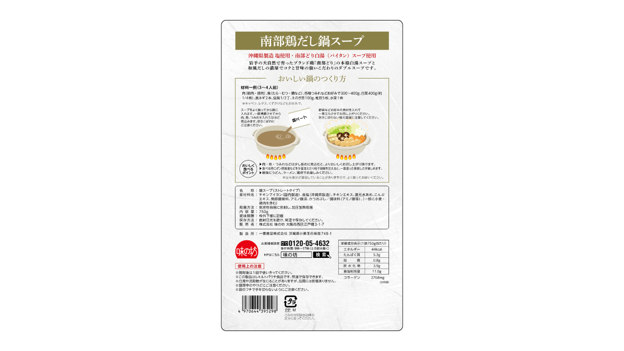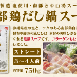 | 原材料名 | チキンブイヨン(国内製造)、食塩(沖縄県産)、チキンエキス、還元水あめ、こんぶエキス、発酵調味料、アミノ酸液、かつおぶし/調味料(アミノ酸等)、(一部に小麦・鶏肉を含む) |