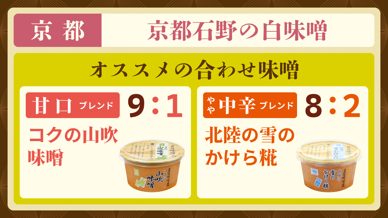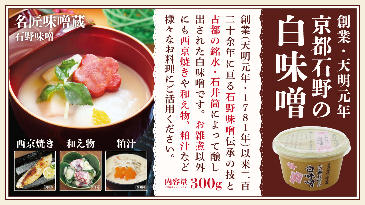 創業(天明元年・1781年)以来二百二十余年に亘る伝承の技と古都の銘水・石井筒によって醸し出された白味噌です。お雑煮や粕汁、西京焼き、和え物など様々なお料理にご活用ください。