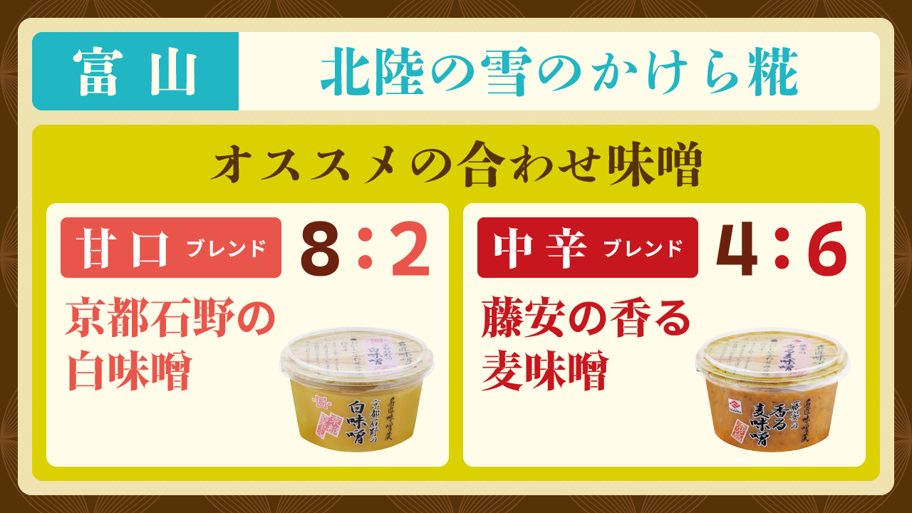 富山県の良質で美味しい地下水で仕込んだ米こうじ味噌です。こうじの粒を残した仕上がりで、ほのかな甘い香りとすっきりとした後味が特徴です。
