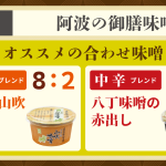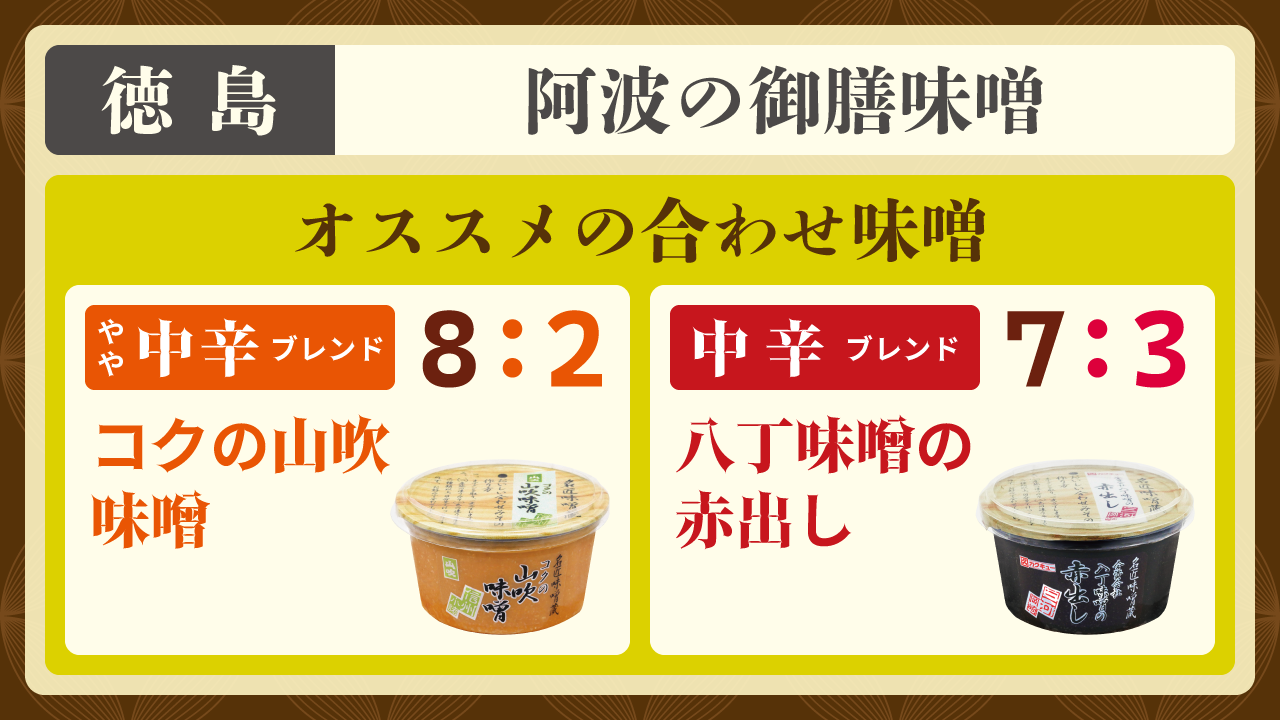 徳島県名産の御膳味噌は、麹歩合が12割以上と多く、甘味と旨味が調和しております。