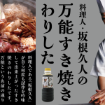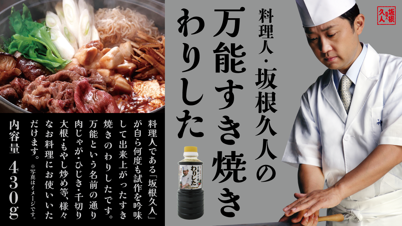 料理人である「坂根 久人」氏が、自ら何度も試作を味見し、吟味した上で出来上がったすき焼のわりしたでございます。「万能」という名前の通り、すき焼だけでなく、肉じゃが・ひじき・千切り大根・もやし炒め等、四季折々の料理に使えるよう、料理人ならではの工夫がされております。ほのかに香る玉ねぎの香ばしさもこの商品の特長です。