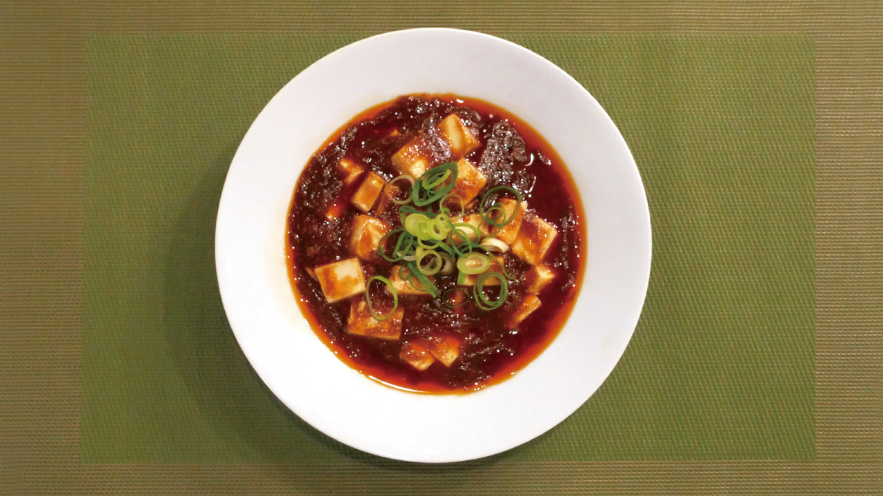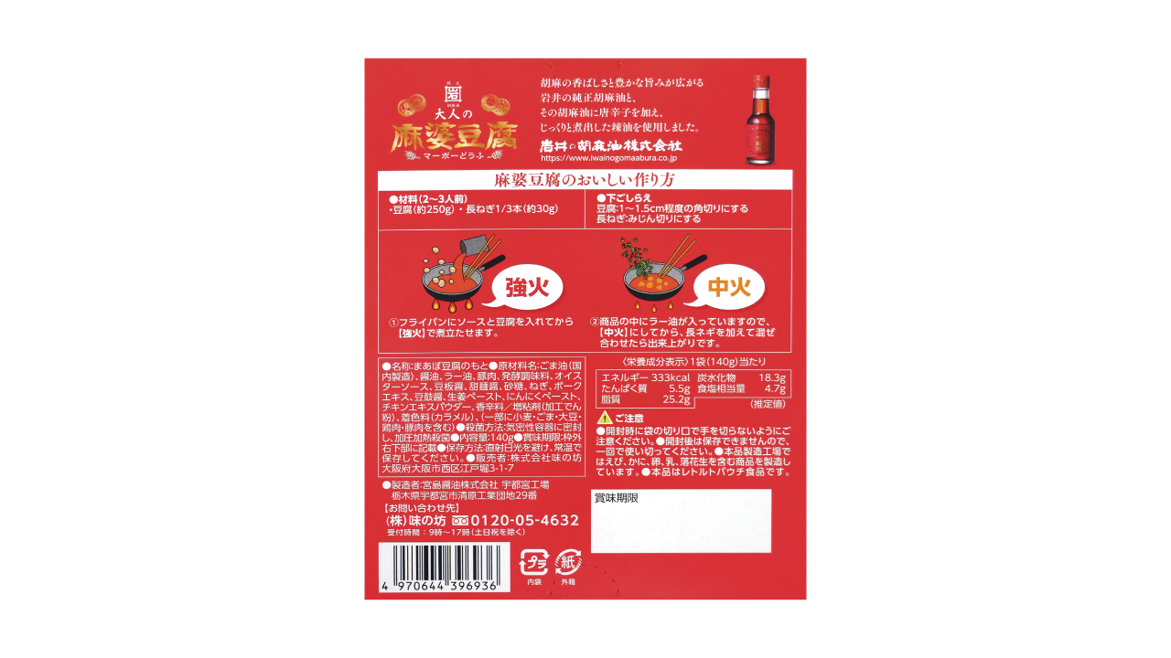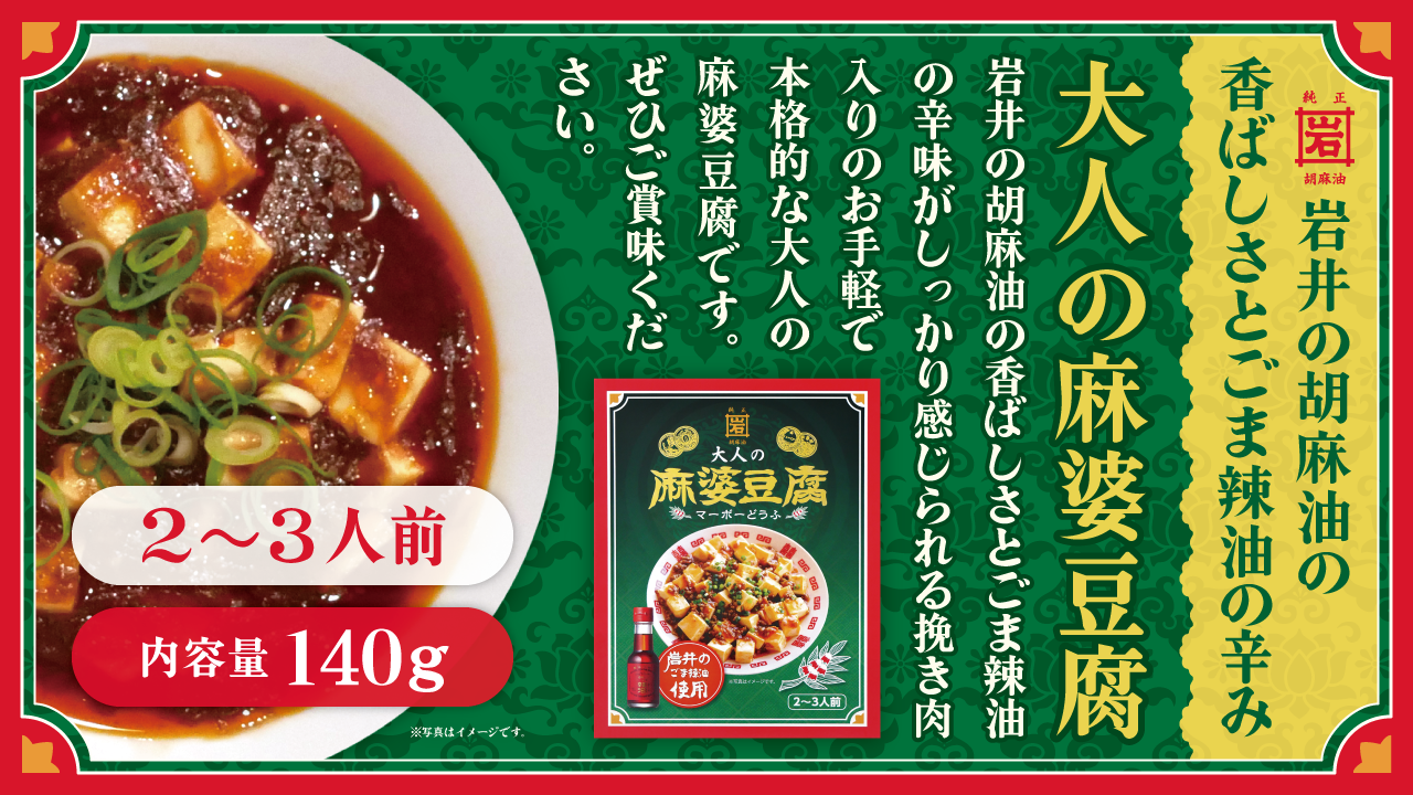 岩井の胡麻油の香ばしさとごま辣油の辛味がしっかり感じられる挽肉入りのお手軽で本格的な大人の麻婆豆腐をお愉しみください。