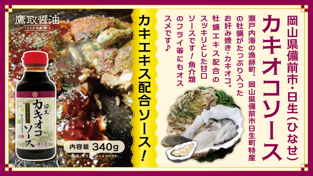 岡山県備前市日生町(ひなせちょう)のご当地グルメとして人気の、牡蠣がたっぷりと入ったお好み焼、「カキオコ」。その「カキオコ」をご家庭でお楽しみいただける、カキエキスを配合したすっきりとした味わいの甘口ソースです。地元・日生のカキオコ提供店で実際に使用されている飲食店も認めた味です。カキオコだけでなく、ご家庭で作るお好み焼や、魚介類のフライにもぴったりです。