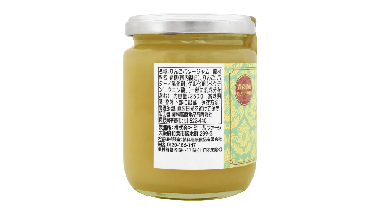 | 原材料名 | 砂糖(国内製造)、りんご、バター/乳化剤、ゲル化剤(ペクチン)、クエン酸、(一部に乳成分を含む。) |