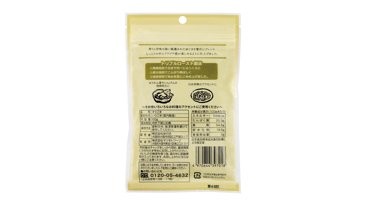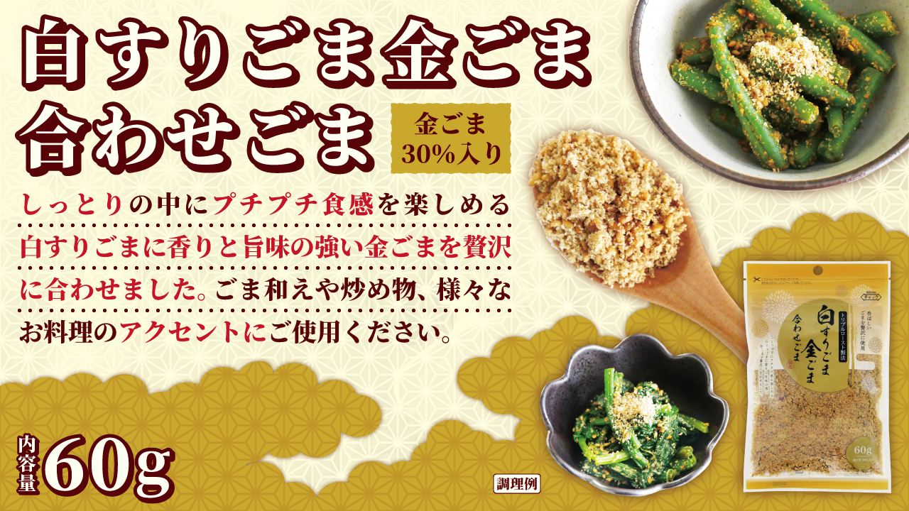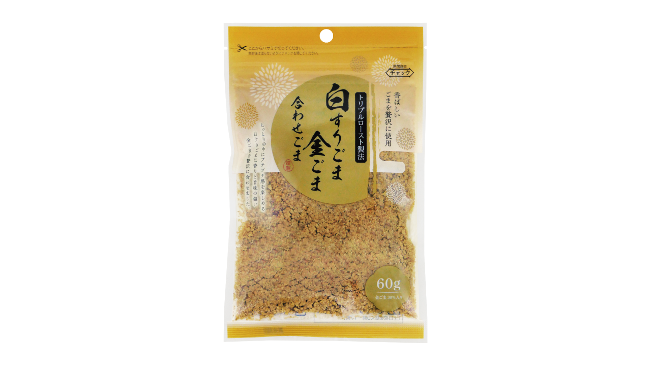 しっとりの中にプチプチ食感を楽しめる白すりごまに香りと旨味の強い金ごまを贅沢に合わせました。ごま和えや炒め物、様々なお料理のアクセントにご使用ください。