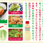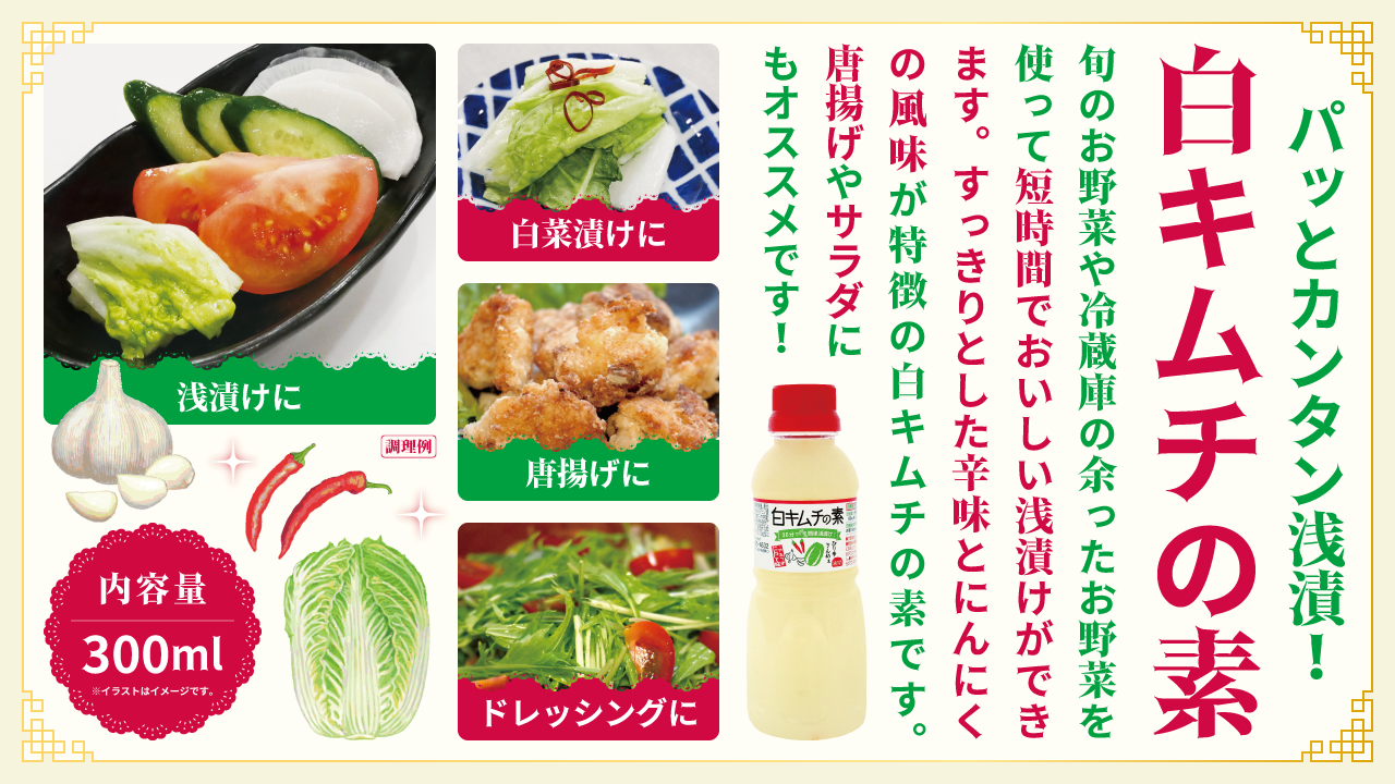 野菜300gに白キムチ80ccを入れ30分程度漬け込むとおいしく頂けます。から揚げの下味付け鶏肉400gに対して白キムチ120ccで30分から1時間漬けて頂ければ美味しい鶏肉に大変身。