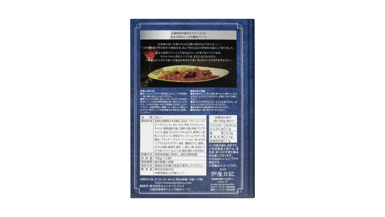 | 原材料名 | 乳等を主要原料とする食品、玉ねぎ、トマト・ジュースづけ、トマトピューレ、カレールウ、牛肉、バナナピューレ、チャツネ、食用油脂(牛脂)、松阪牛牛脂、砂糖、デミグラスソース、醤油、エビエキス、チキンエキス、香辛料、小麦粉、リンゴピューレ、野菜エキス、クリームパウダー(乳製品)、ブランデー、ウスターソース、カレー粉、はちみつ、アサリエキスパウダー、食塩、/調味料(アミノ酸等)、カラメル色素、酸味料、香料、(一部に小麦・乳成分・えび・牛肉・バナナ・りんご・ごま・豚肉・鶏肉・大豆を含む) |