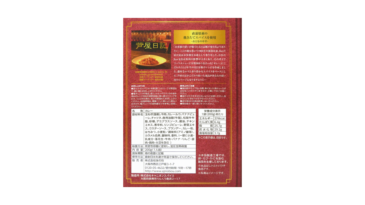 | 原材料名 | 玉ねぎ(国産)、牛肉、カレールウ、バナナピューレ、チャツネ、食用油脂(牛脂)、松阪牛牛脂、砂糖、デミグラスソース、醤油、チキンエキス、香辛料、リンゴピューレ、野菜エキス、ウスターソース、ブランデー、カレー粉、はちみつ、小麦粉/調味料(アミノ酸等)、カラメル色素、酸味料、香料、(一部に小麦・乳成分・落花生・牛肉・バナナ・りんご・豚肉・鶏肉・大豆を含む) |