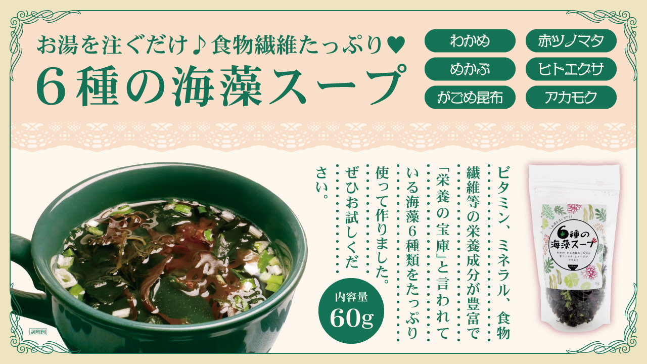 栄養成分が豊富な海藻6種をたっぷりと使った満足感のあるスープになります。